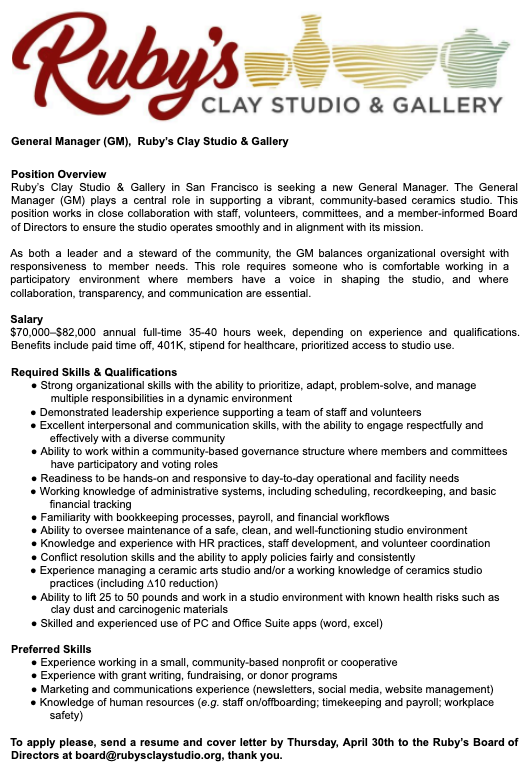 Ruby's Clay Studio is a non-profit arts center whose objectives are to promote community appreciation of the ceramic arts and to encourage self-expression and technical and artistic development through exhibitions, classes and the resources provided by a shared learning facility.